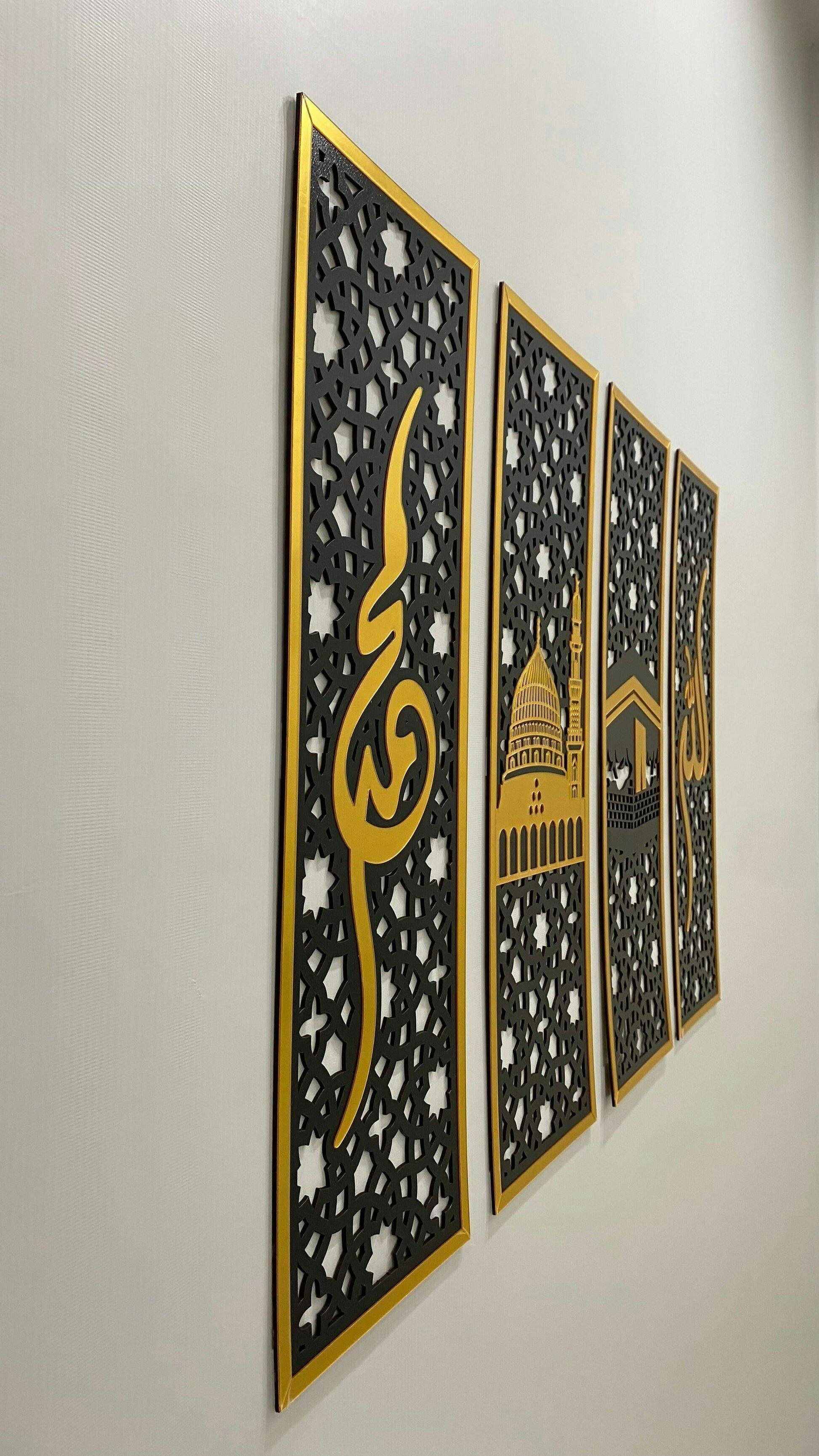 Set of 4 Islamic Wall Sceneries – Allah, Muhammad (SAW), Kaaba & Masjid an Nabawi Calligraphy | Golden Acrylic Islamic Wall Art | Buy Online in Pakistan
